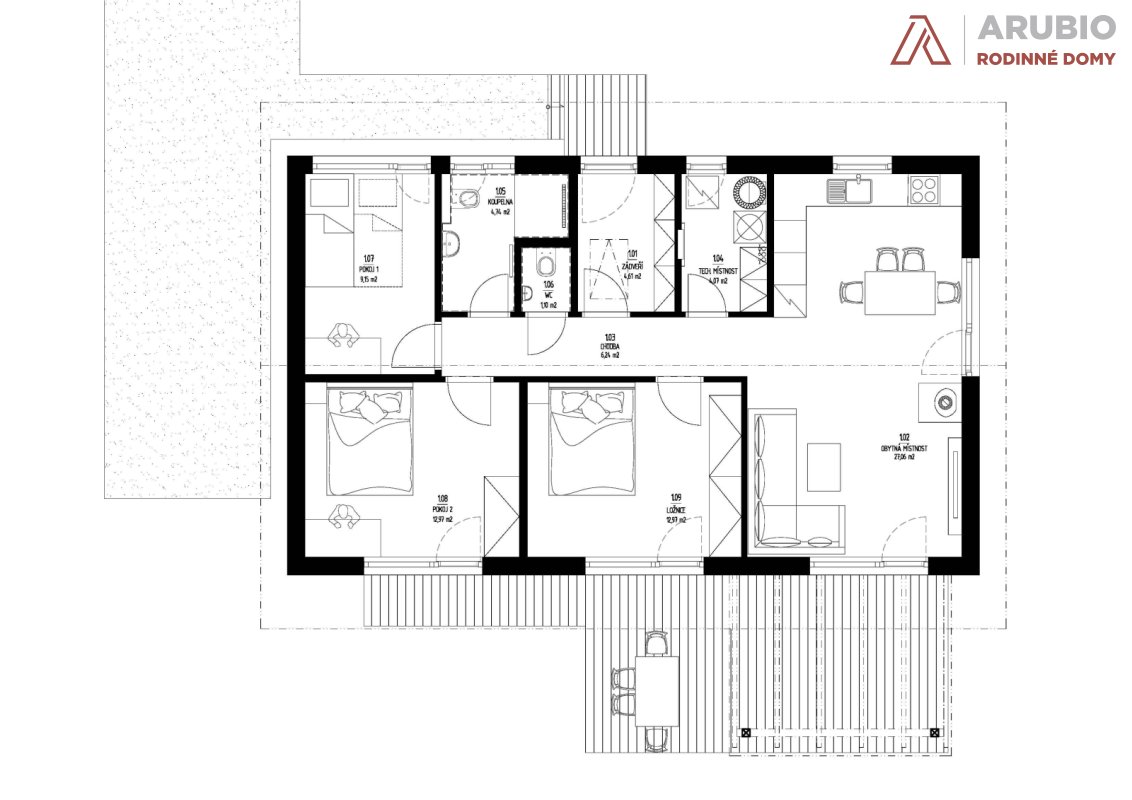 Vstup do chaty je řešen severně orientovaným vstupem do místnosti zádveří, ze které je přístupná chodba, která propojuje všechny místnosti chaty. Jsou navrženy tři ložnice, koupelna a samostatné WC, technická místnost, kde se nachází veškeré technické zázemí chaty. Dále se nachází hlavní pobytová místnost, která zahrnuje kuchyň, jídelnu a obývací pokoj s výstupem na jižně orientovanou částečně zastřešenou terasu.