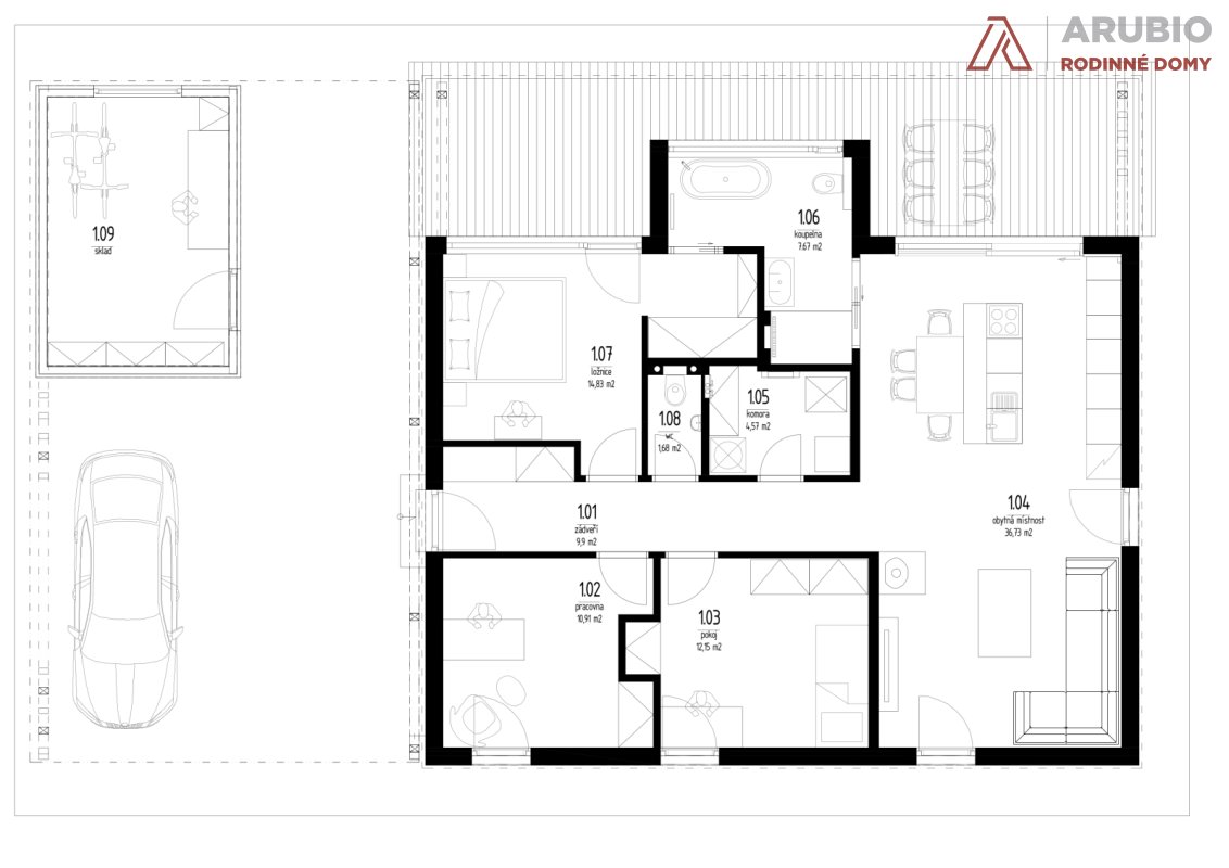 Dále jsou na levé straně chodby umístěny samostatné WC a technická místnost s kompletním technickým zázemím domu a výstupem do ateliéru v podkroví. Hlavní obytná místnost tvoří otevřený prostor obývacího pokoje, jídelny a kuchyně, odkud je přímý vstup na východně orientovanou krytou terasu pomocí francouzského okna.