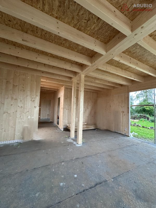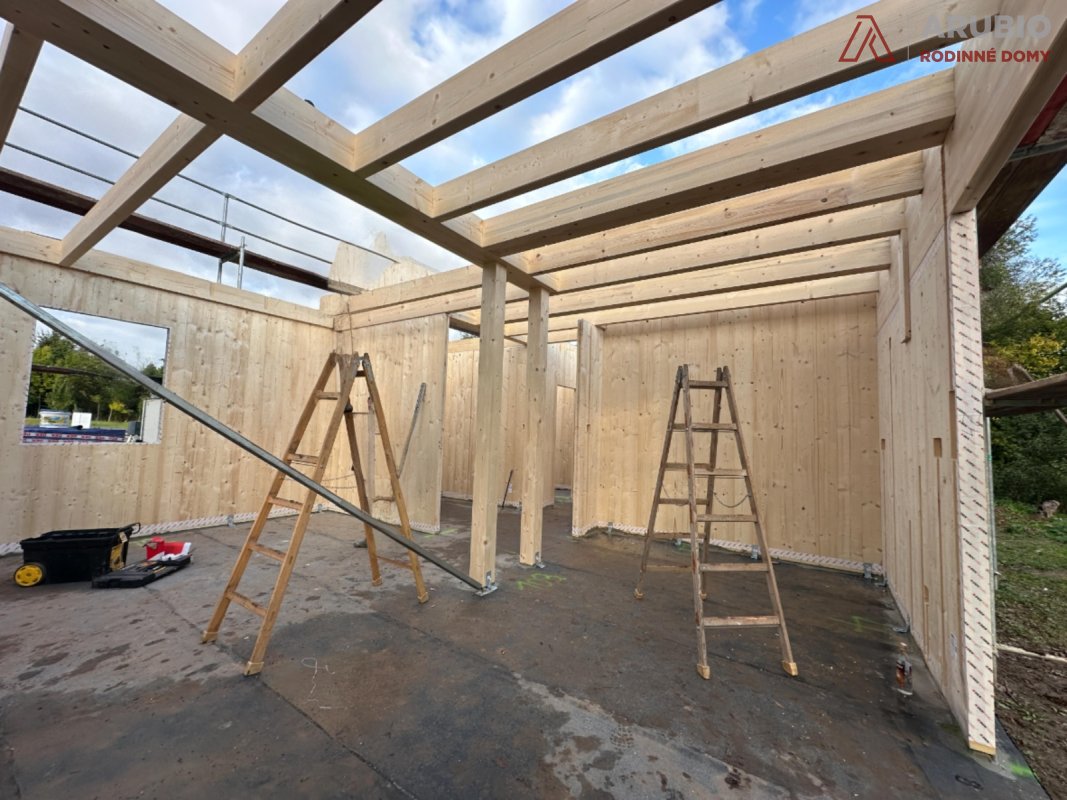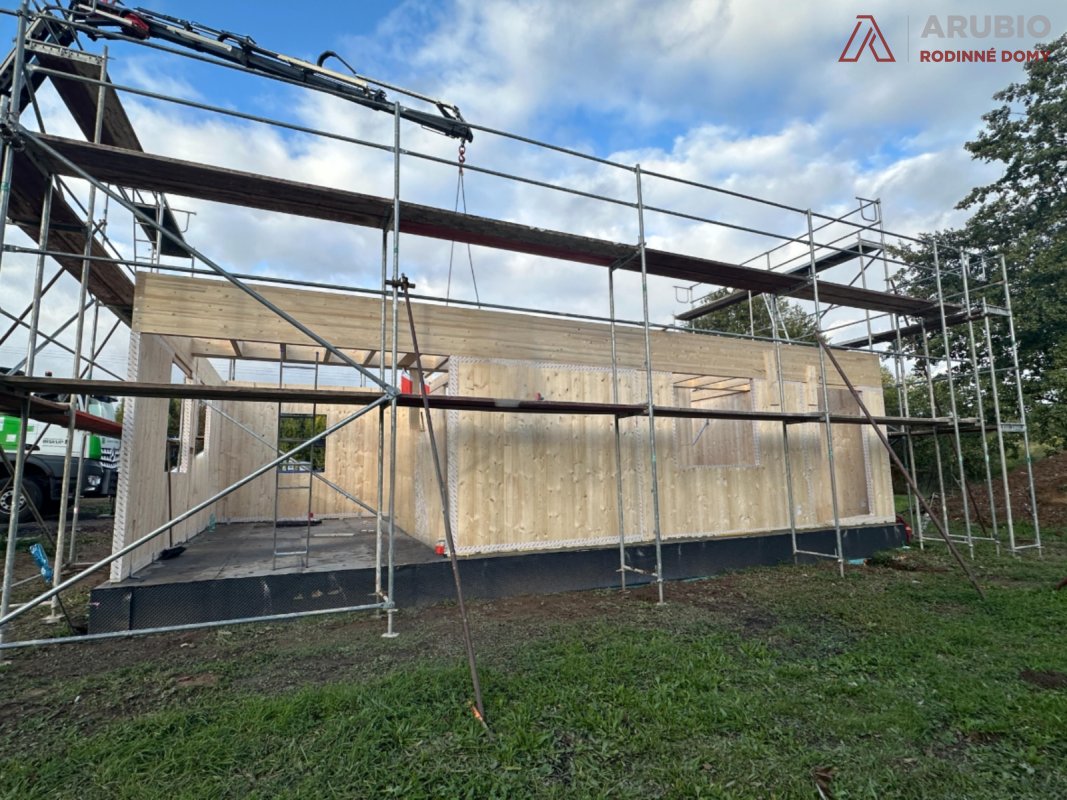 Rodinný dům bude realizován jako moderní jednopodlažní objekt s obytným podkrovím, navržený ve formě dřevostavby s konstrukcí z masivních nosných DEK panelů. Půdorys bude mít obdélníkový tvar o rozměrech 7,6 × 12,1 m, což umožní efektivní využití prostoru a kompaktní architekturu s důrazem na energetickou úspornost.