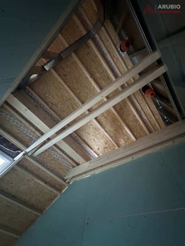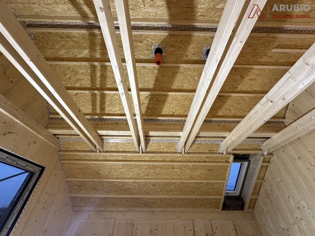 Z chodby povede schodiště do podkroví, kde budou umístěny tři dětské pokoje, hlavní ložnice a koupelna s WC a vanou. Podkroví tak poskytne dostatek prostoru pro pohodlné rodinné bydlení.