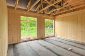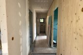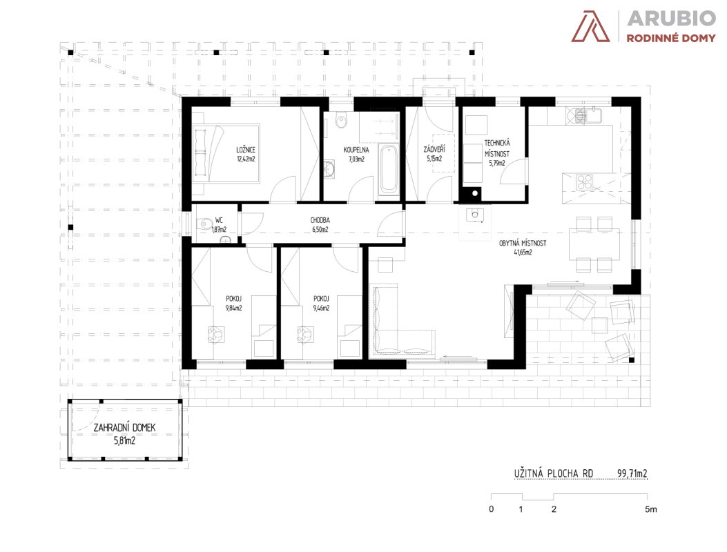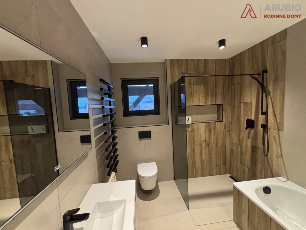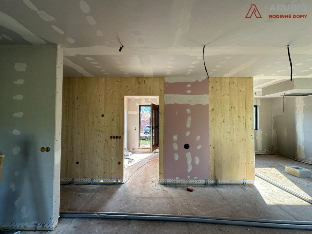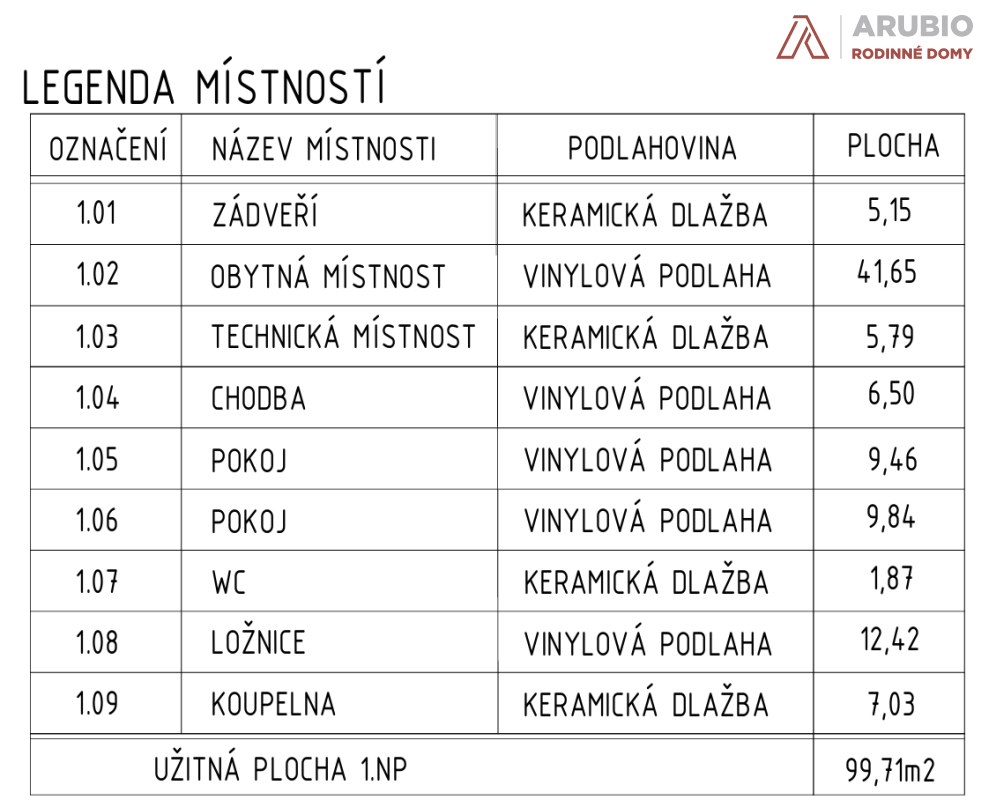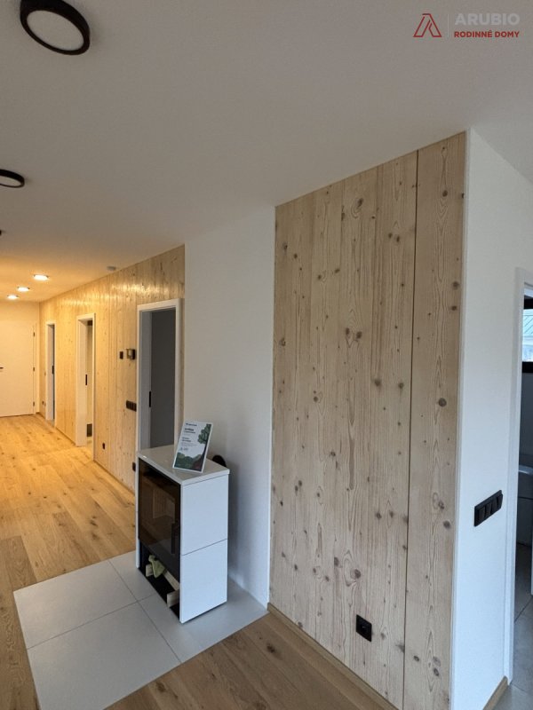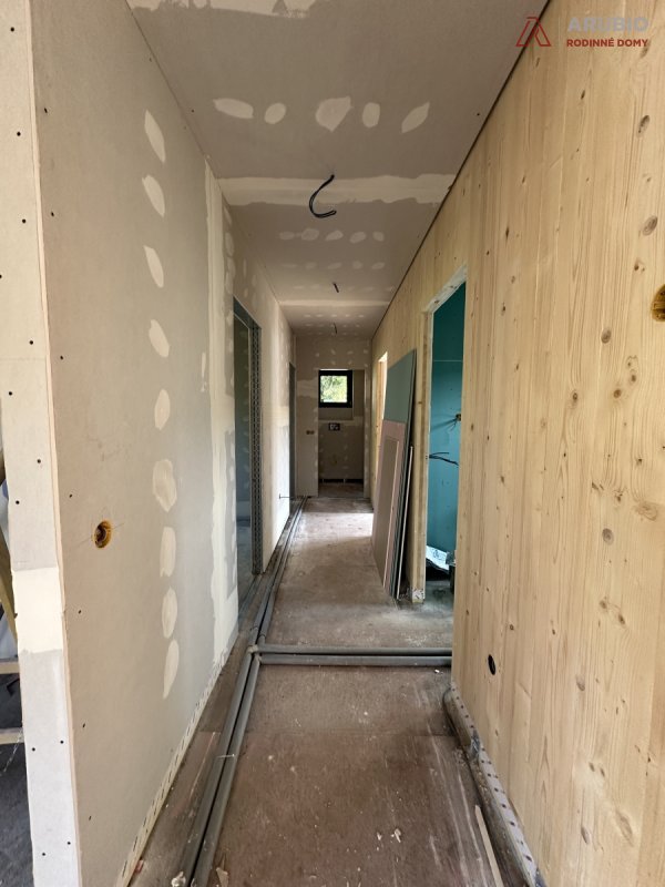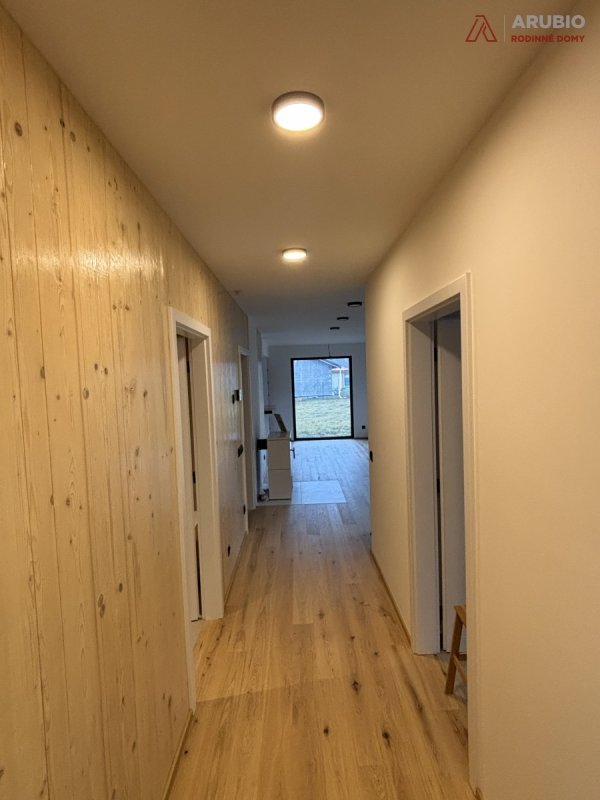 Centrální chodba z obytné místnosti umožňuje přístup do ložnice, dvou pokojů, koupelny a samostatného WC. Ložnice je situována na klidnější severovýchodní stranu, dětské pokoje pak na slunný jihozápad, což zajišťuje optimální osvětlení během dne. Celkově dispozice domu vytváří harmonický tok mezi jednotlivými místnostmi a umožňuje pohodlný a praktický život pro jednu domácnost.