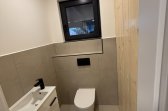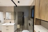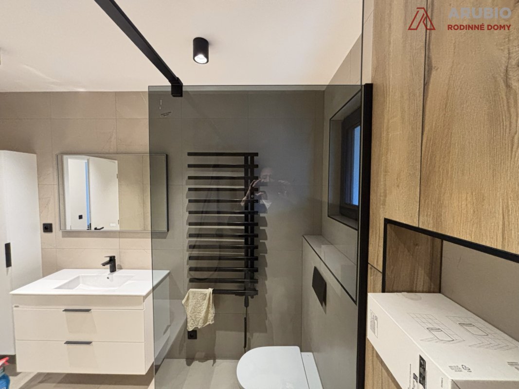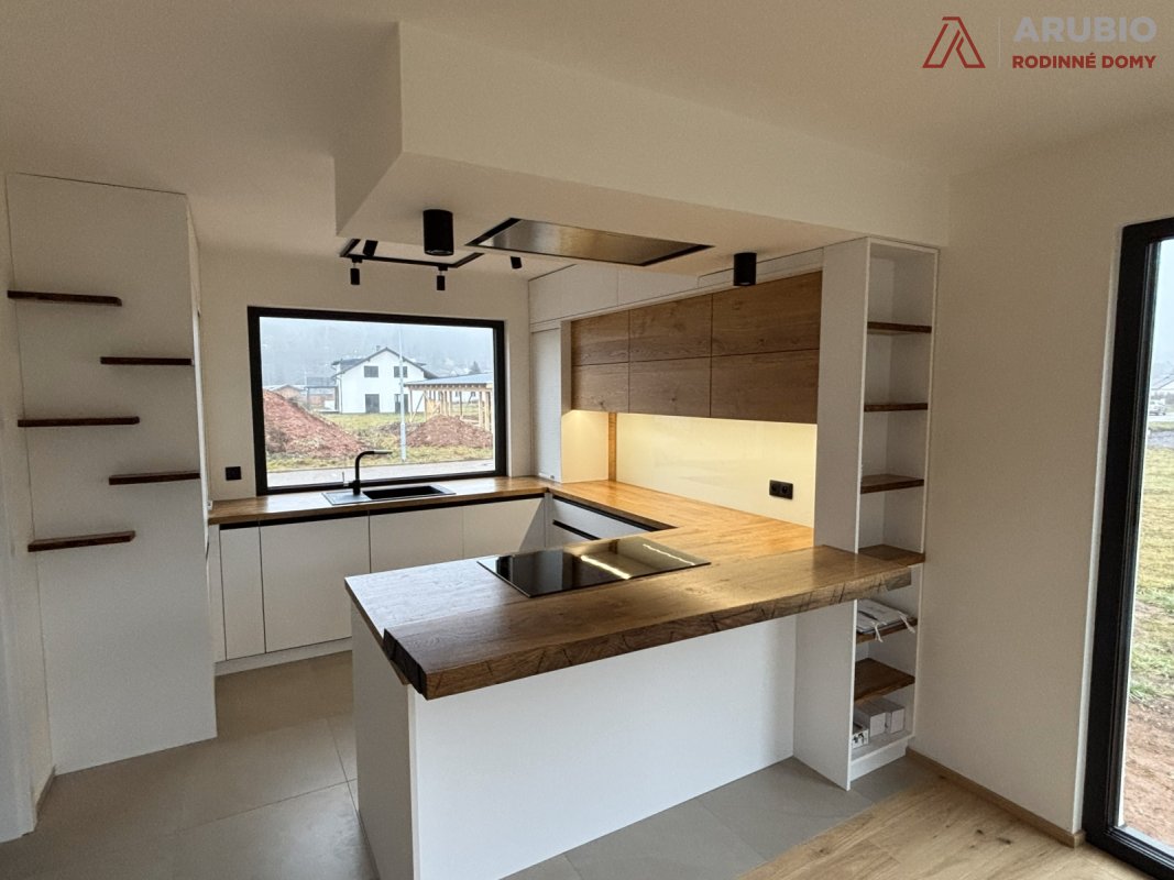 Hlavní obytný prostor elegantně propojuje kuchyň s technickou místností, jídelnu a obývací pokoj. Z obývacího pokoje je přímý výstup francouzskými okny na krytou terasu, která plynule spojuje interiér s venkovním prostorem a zároveň zajišťuje dostatek denního světla.