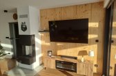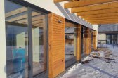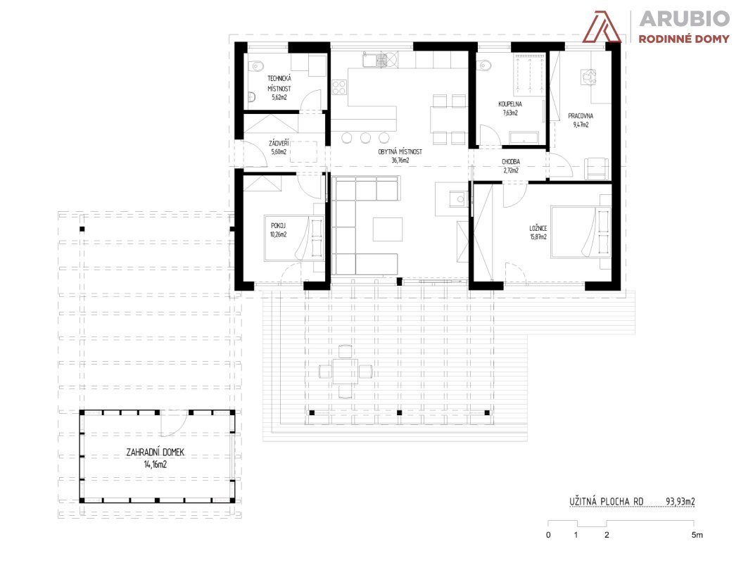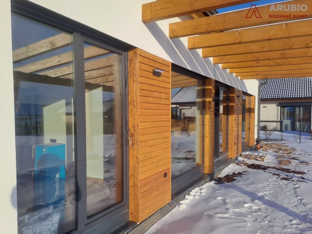 Na jižní straně domu se obytný prostor otevírá směrem do zahrady a plynule přechází na dřevěnou, částečně zastřešenou terasu. Ta se stává přirozeným prodloužením interiéru – místem pro ranní kávu, letní večeře i klidné večery pod širým nebem. Nechybí ani zahradní domek s krytým stáním pro dvě auta, který prakticky doplňuje celý koncept domu.