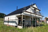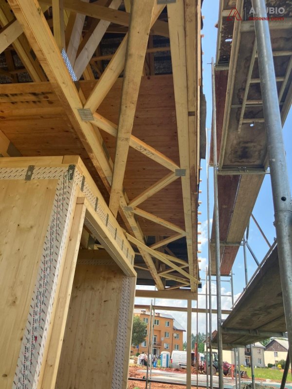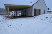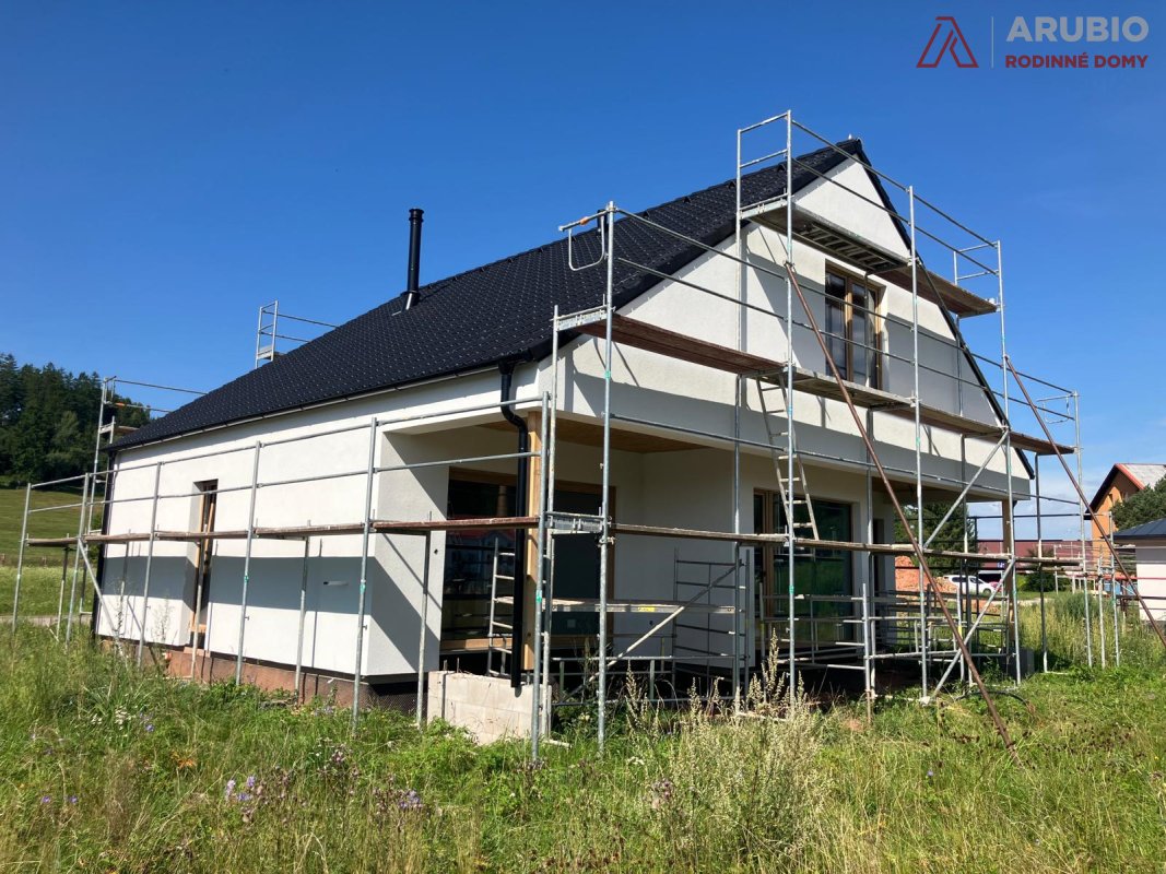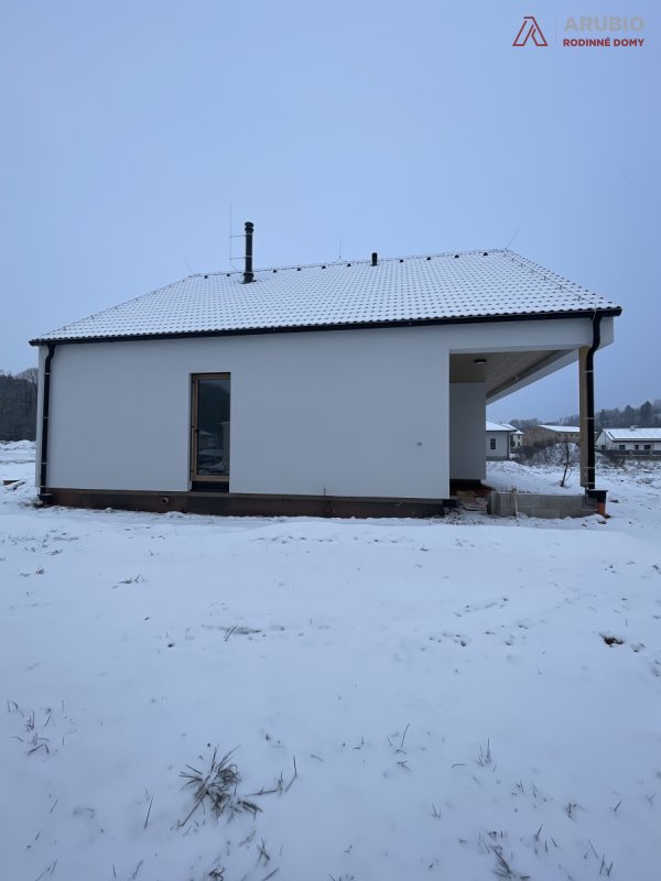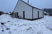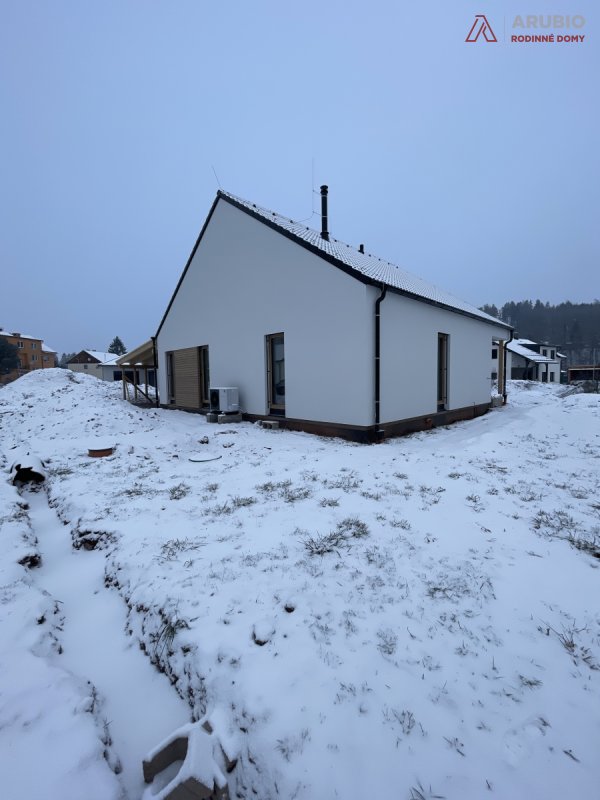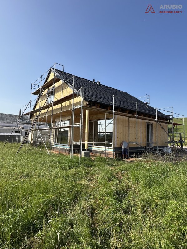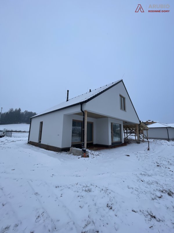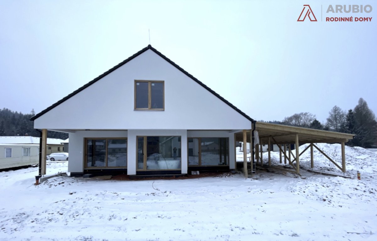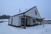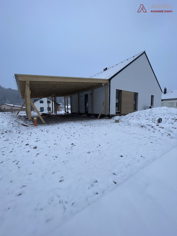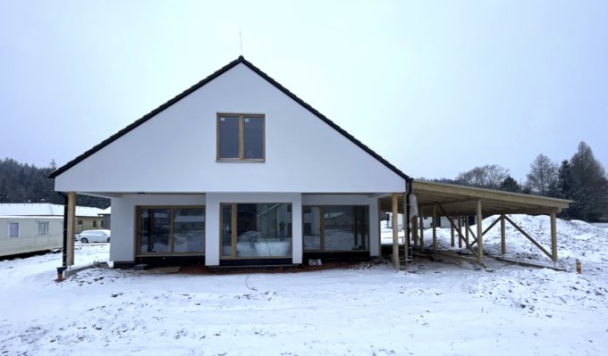 Fasáda domu kombinuje elegantní krémově bílou omítku s částečným dřevěným obkladem, zatímco podbití z přírodní bělené palubky celý výraz jemně doplňuje. Čisté linie, funkčnost a estetika zde vytvářejí vyvážený celek, který podtrhuje moderní a zároveň přirozený charakter stavby. Tento dům není jen místem k bydlení – je to prostor pro život s lehkostí, stylem a respektem k přírodě.