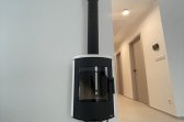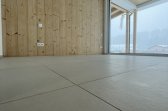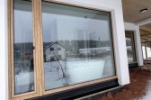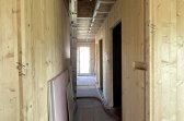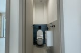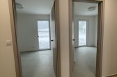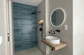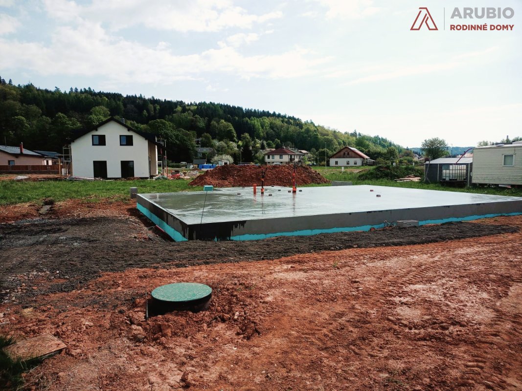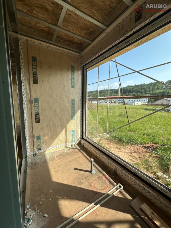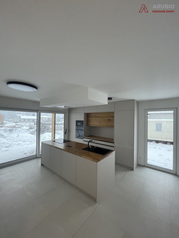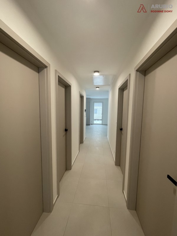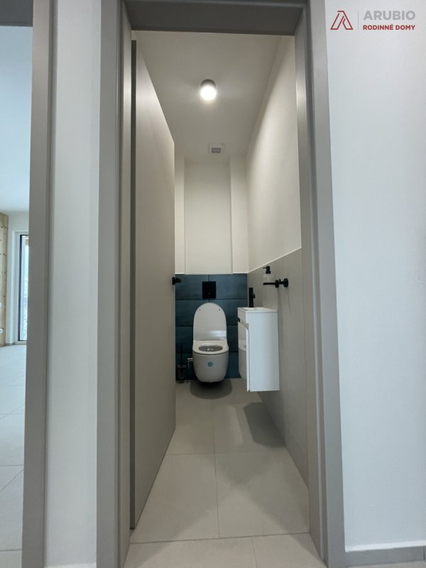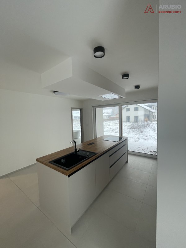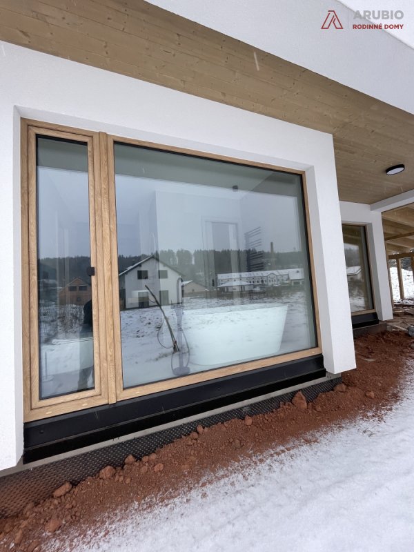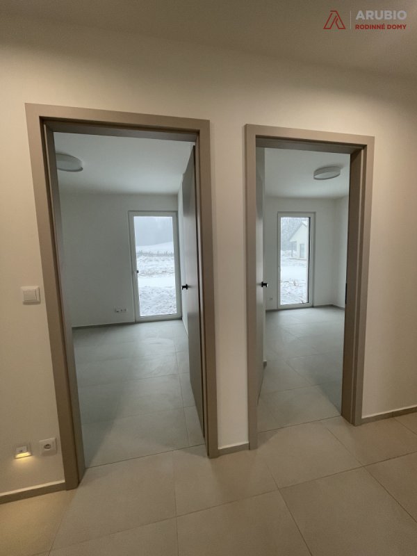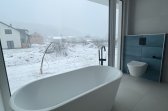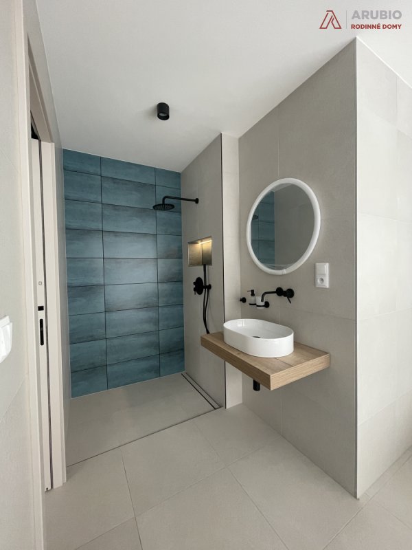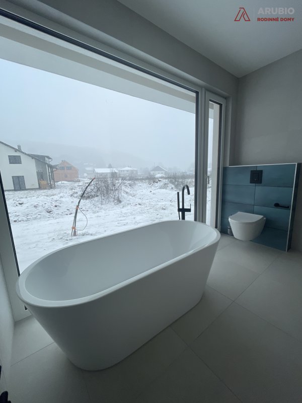 Dispoziční řešení je promyšlené do posledního detailu. Vstup ze severní strany vede do zádveří, které přechází v centrální chodbu propojující všechny obytné místnosti. Pravá část domu nabízí pracovnu a dětský pokoj, zatímco levá je vyhrazena klidové zóně – hlavní ložnici se šatnou a vlastní koupelnou. Ta je navíc přístupná i z hlavního obytného prostoru, což zvyšuje komfort každodenního užívání. Koupelna dokonale vystihuje celkový koncept domu – minimalismus, světlo a klid. Jemné světlé obklady v kombinaci s přírodní dřevěnou deskou pod umyvadlem vytvářejí nadčasovou eleganci. Solitérní vana umístěná u velkoformátového okna nabízí jedinečný zážitek z relaxace s výhledem do krajiny. Černé baterie a detaily dodávají prostoru moderní kontrast a sofistikovaný výraz, zatímco kruhové zrcadlo zjemňuje celou kompozici.