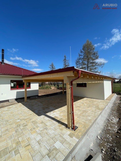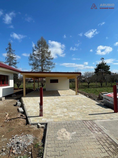 Součástí pozemku je samostatný objekt zahradního skladu se zastřešeným stáním pro dvě osobní auta. Architektonicky navazuje na hlavní dům a vytváří jednotný, esteticky sladěný celek. Sklad poskytuje dostatek prostoru pro zahradní techniku, kola, sportovní vybavení i sezónní potřeby – vše má své místo a zůstává přehledně uspořádáno. Zastřešené stání chrání vozidla před nepřízní počasí a zároveň nabízí pohodlný přístup suchou nohou přímo k domu.