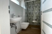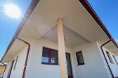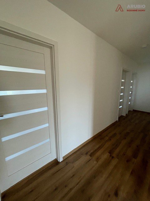 Vstup do domu je orientován na jih a chráněn architektonicky čistou nikou, která poskytuje praktické zastřešení. Ze zádveří je přístupné samostatné WC a komora s technickým zázemím domu, plynule navazující na hlavní chodbu. Centrální chodba přehledně propojuje celý dům a rozděluje jej na klidovou a společenskou část. V levé části se nachází ložnice rodičů s vlastní koupelnou – soukromý prostor pro odpočinek – a tři dětské pokoje, které mohou růst spolu s potřebami rodiny. Nechybí ani druhá koupelna, která zajišťuje pohodlí při ranním shonu i večerním ukládání dětí ke spánku. Srdcem domu je velkorysý obytný prostor spojující obývací pokoj, kuchyni a jídelnu. Otevřená dispozice podporuje společné chvíle – od rodinných večeří přes víkendové pečení až po klidné večery u kamen. Velkoformátové balkonové dveře přirozeně propojují interiér se zastřešenou terasou a zahradou, čímž rozšiřují obytný prostor směrem ven.